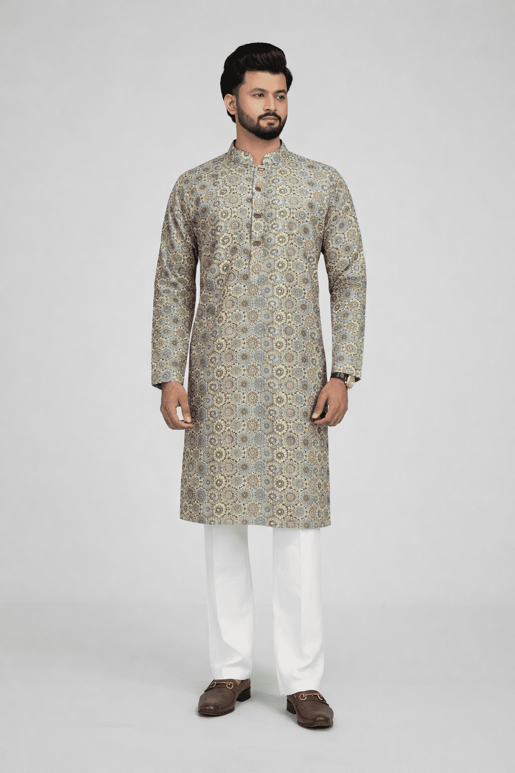 Style-Ethnic Printed Panjabi-Sage green Fabric – 100% printed Cotton Button – Premium snap button Color- Sage Green কলার: Mandarin / Band Collar স্লিভ: Full Sleeve