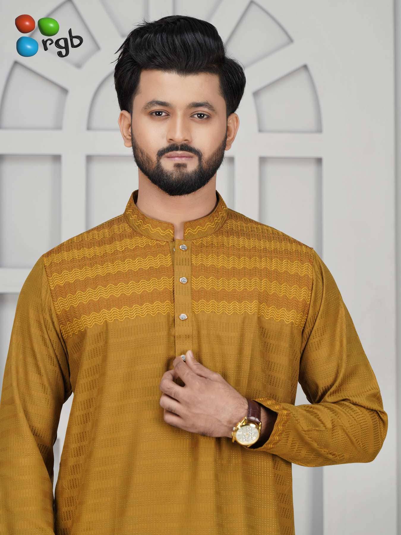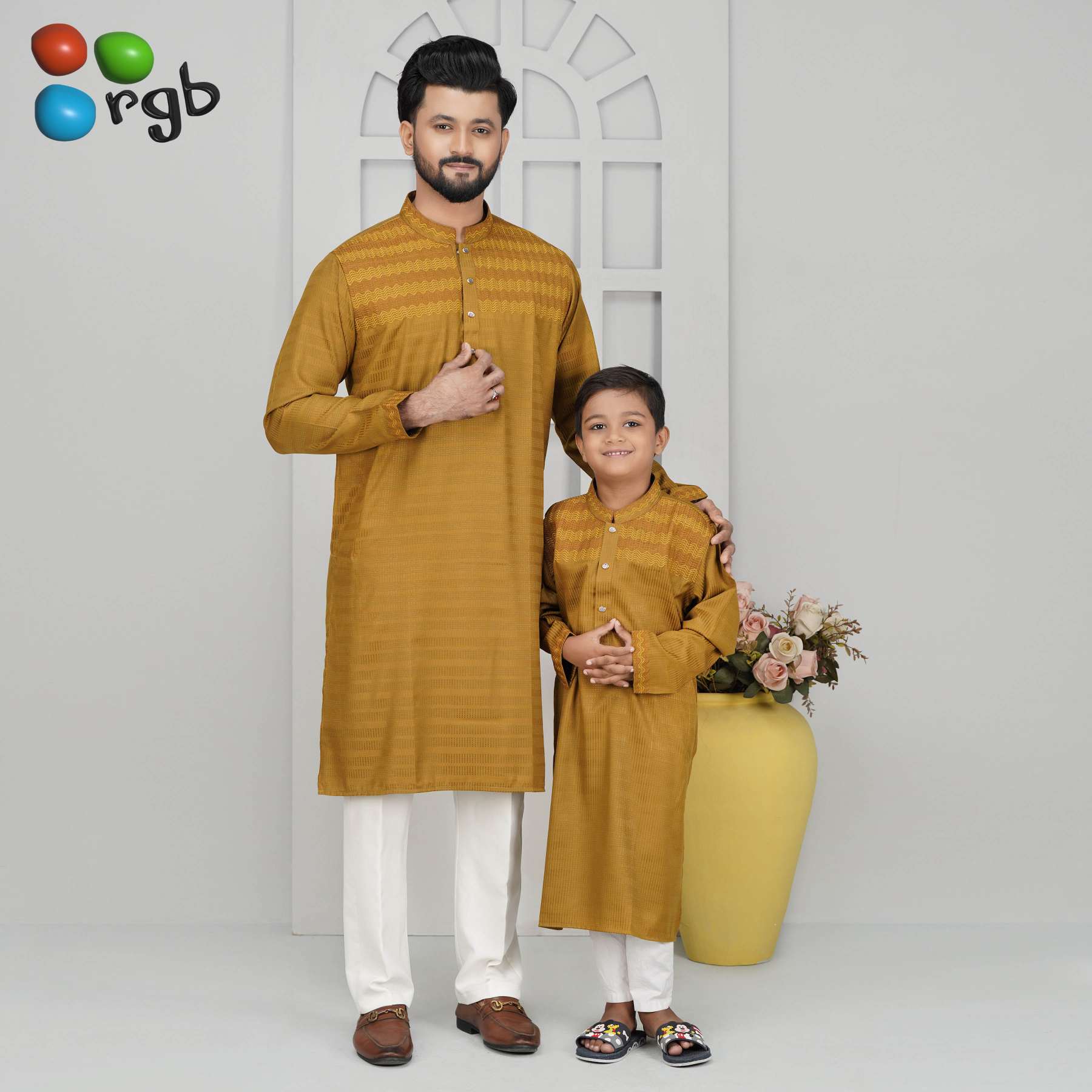 Premium father & son textured body Panjabi – Golden Mustard Elegant Edition