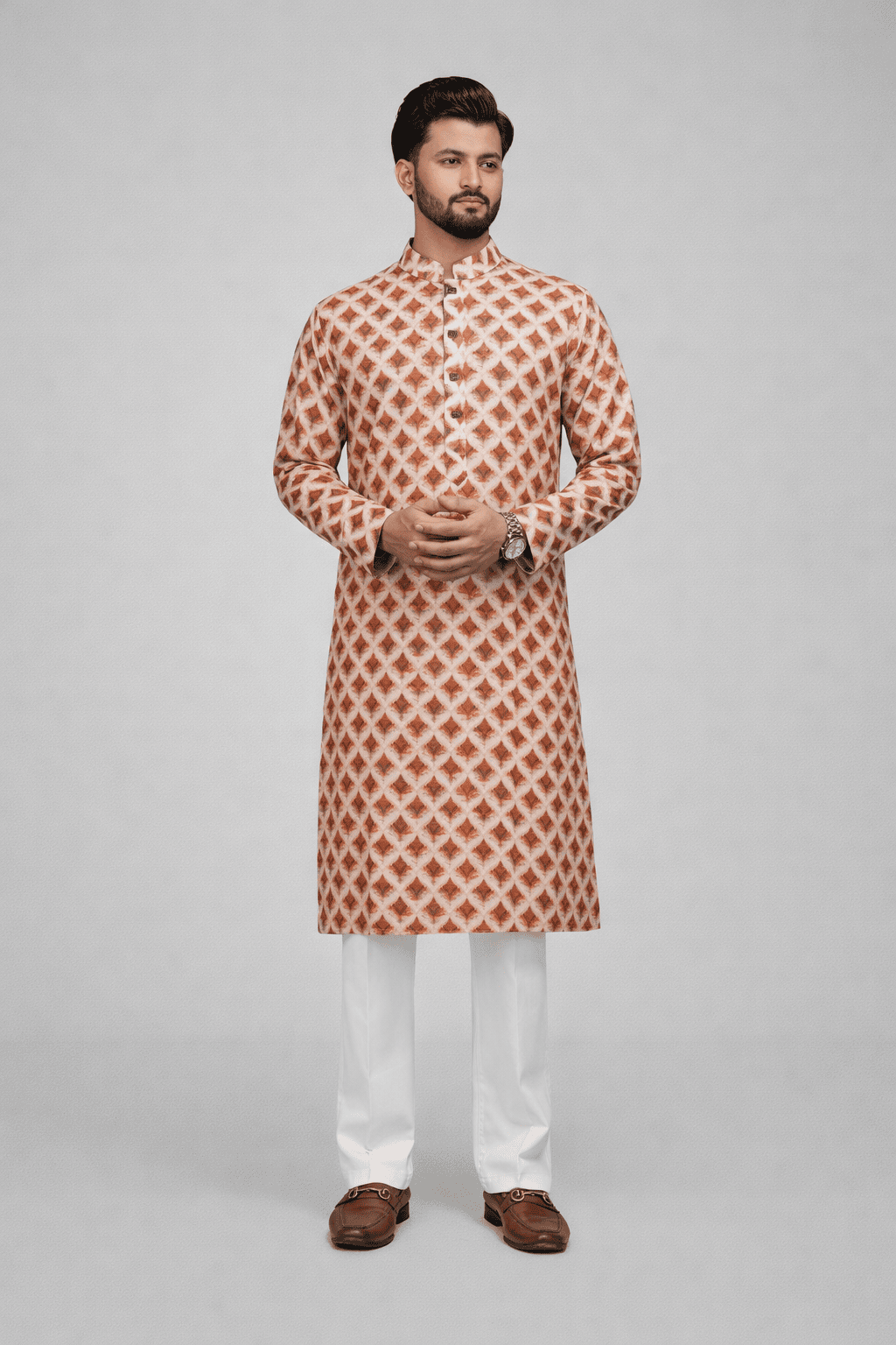Style- Soft orange ethnic print Fabric – 100% printed Cotton Button – Premium snap button Color- Soft Orange কলার: Mandarin / Band Collar স্লিভ: Full Sleeve