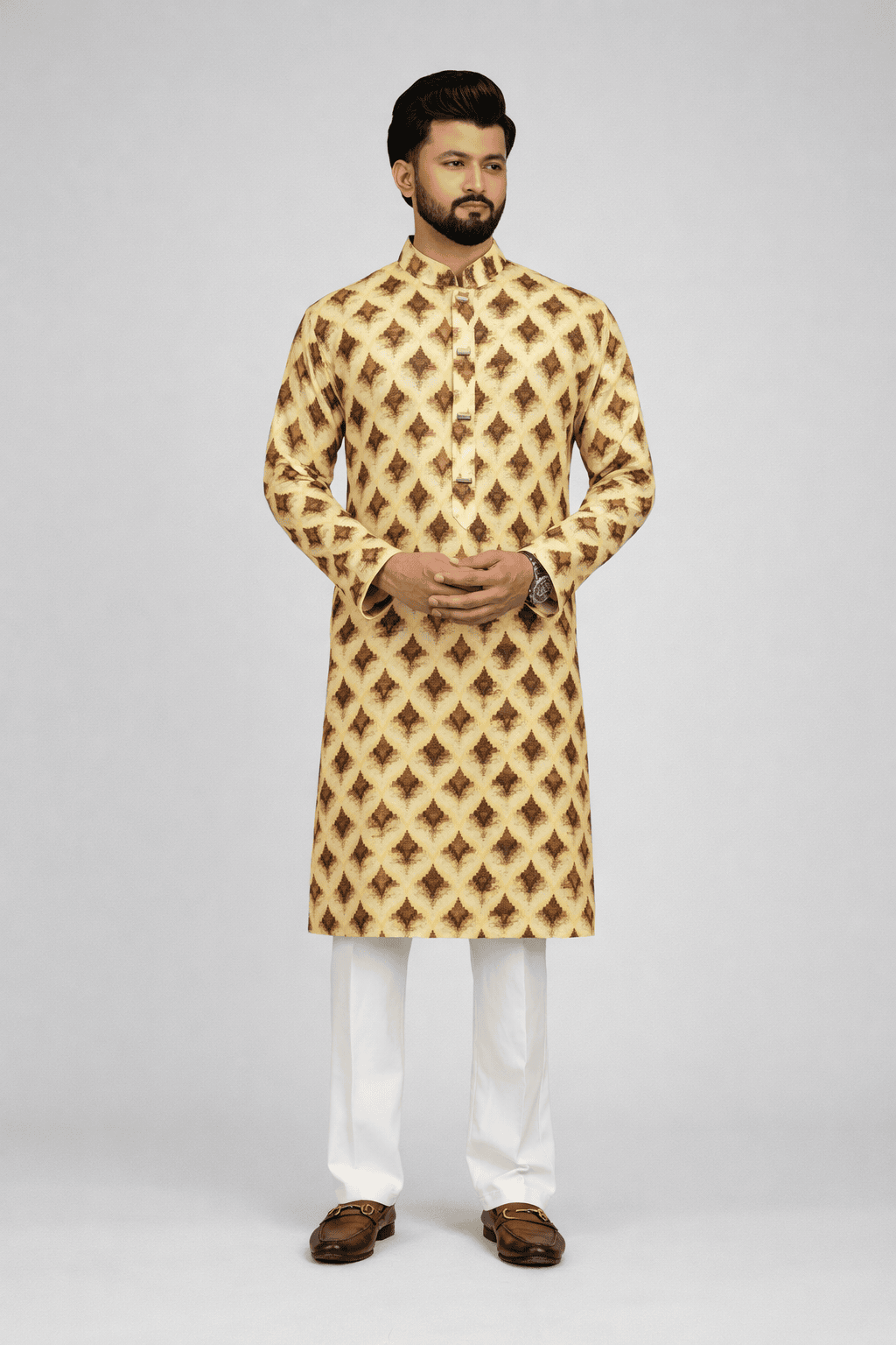 Warm Mustard Yellow with Dark Brown Print panjabi